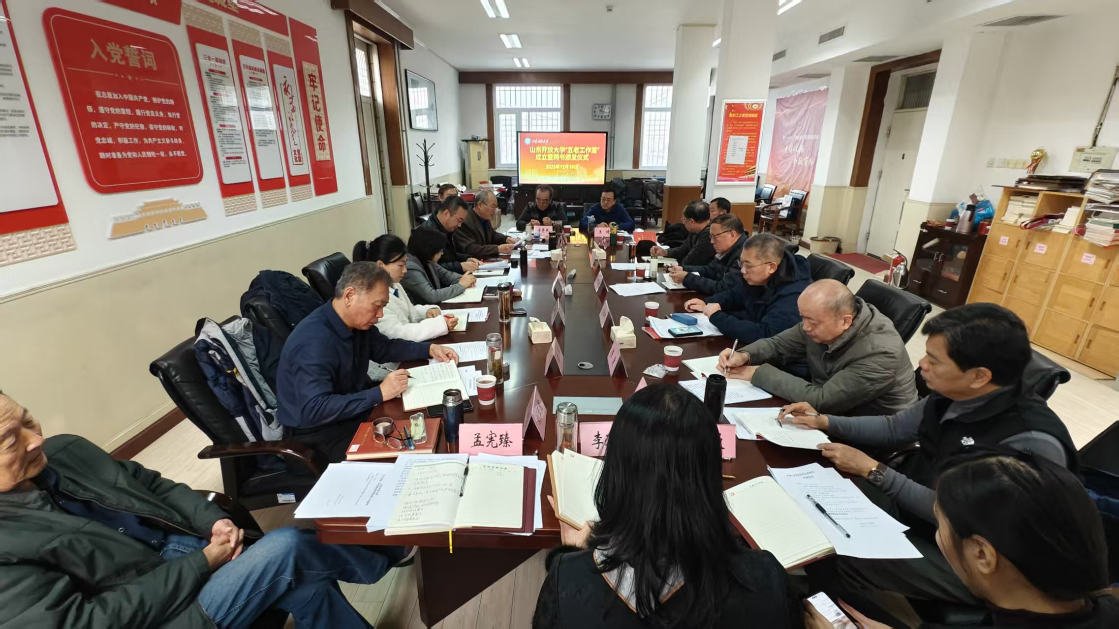 2025年12月19日,山东开放大学离退休干部党委理论学习中心组(扩大)2025年第10次集体学习暨“五老工作室”专题会议在舜耕路10号老干部活动中心顺利召开。学校党委副书记、关工委主任王瑛出席会议并讲话,党委委员、组织部部长、关工委副主任程亮参加会议,离退休干部党委书记陈骥主持会议。